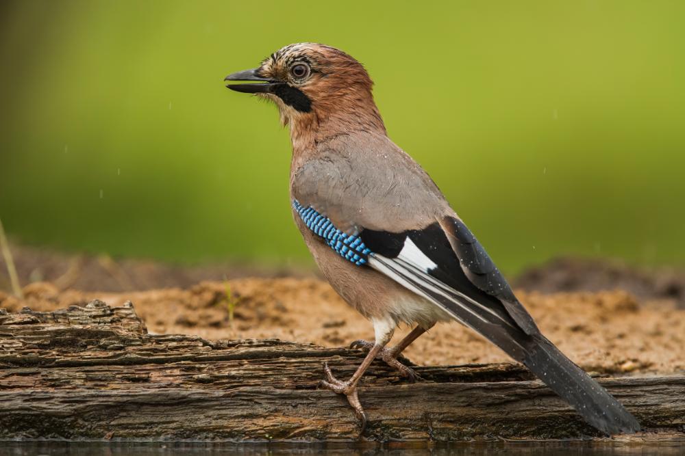 Appearance: Light brown with a white rump, black tail, black moustache stripe, whitish forehead with black longitudinal stripes, and pink legs. The most striking feature is blue and white bars on the wings.