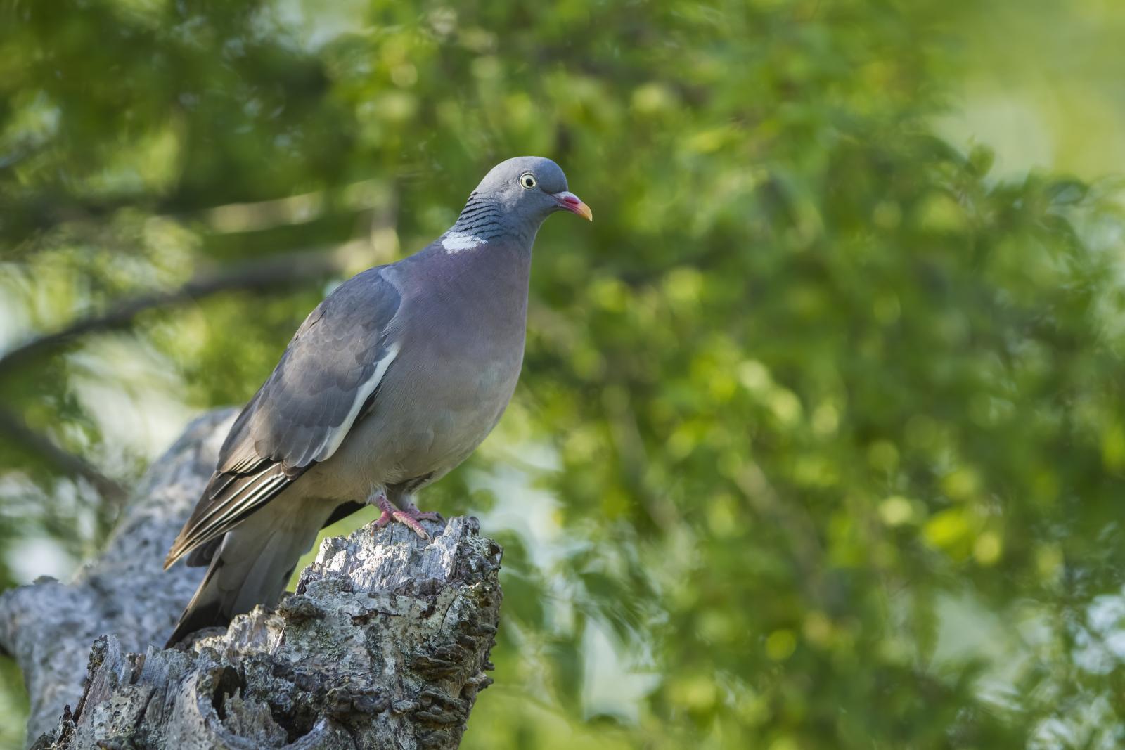 Appearance: The largest representative of pigeons in Lithuania. The body is reddish brown, the back, wings and head are bluish-grey with black tips and a black stripe on the tail. When flying, white crescents on the neck and wings are clearly visible. Legs are pink, toes not webbed.