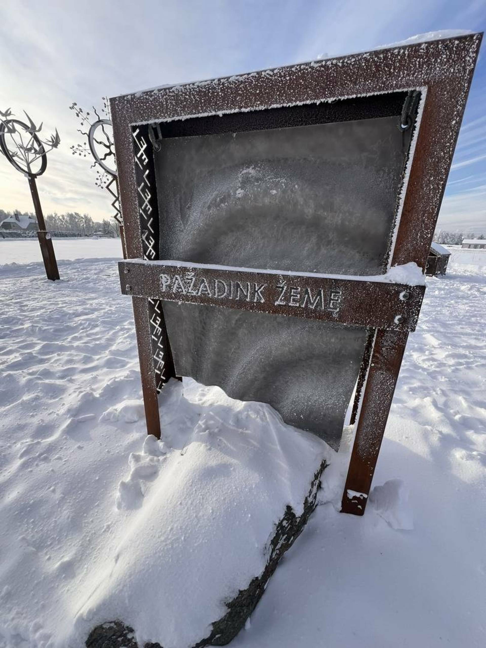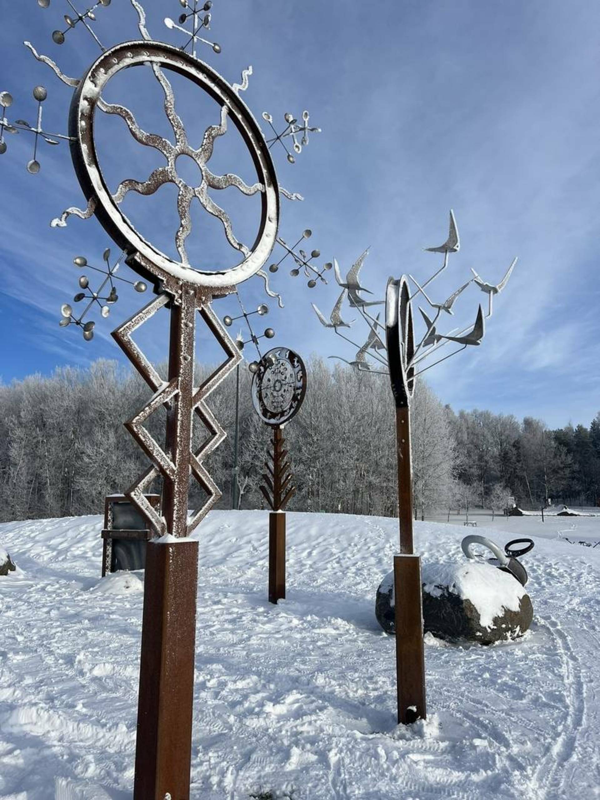 The sculptures are made of metal and stone to blend harmoniously into the environment and match the existing symbols – the Dovilan star and the stone of the Lithuanian Centennial Oak Grove.