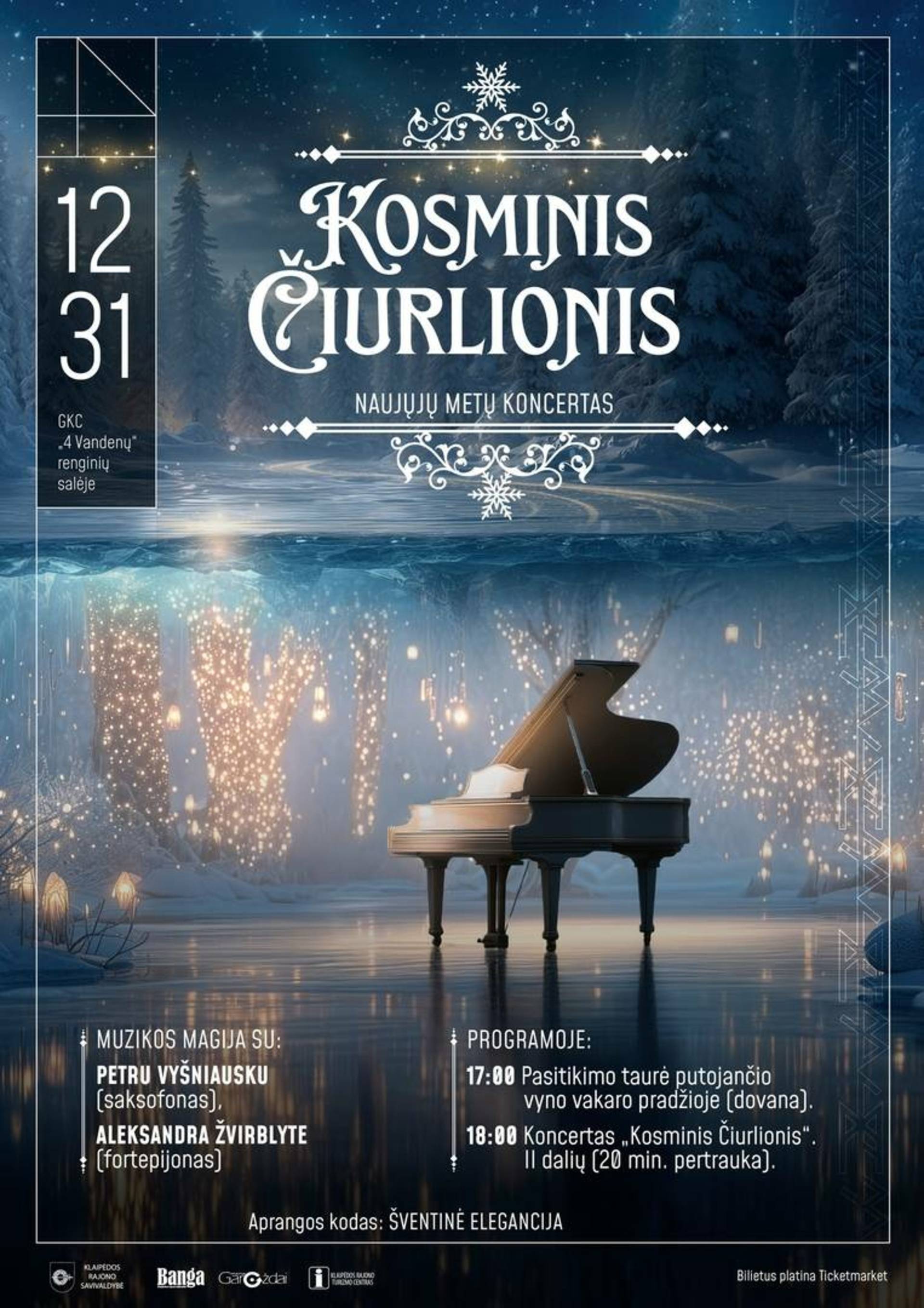 Jūsų laukia dviejų dalių Naujųjų metų koncertas „Kosminis Čiurlionis“. Šiemet pirmą kartą Naujuosius metus Gargždai sutiks neįprastai – su klasika, įkvėpta kosminių M. K. Čiurlionio vizijų. GKC „4 Vandenų“ salėje susitiks legendinis saksofonininkas Petras Vyšniauskas ir tarptautinį pripažinimą pelniusi pianistė Aleksandra Žvirblytė. Duetas pristatys subtilų originalių Čiurlionio ir jo amžininkų kūrinių susiliejimą su laisvų improvizacijų energija – vakaras, kuris paliks nepamirštamą įspūdį. Ši programa – viena ryškiausių M. K. Čiurlionio muzikos festivalio projektų. Ji apkeliavo koncertų sales Lietuvoje, buvo transliuojama per LRT, o vėliau skambėjo tarptautinėse scenose Londone, Vokietijoje, Ispanijoje, Prancūzijoje, Izraelyje, Lenkijoje ir Latvijoje, sulaukusi audringų ovacijų ir pripažinimo. Vakaro pradžioje nuo 17 val. svečius pasitiksime taure putojančio vyno (dovana).