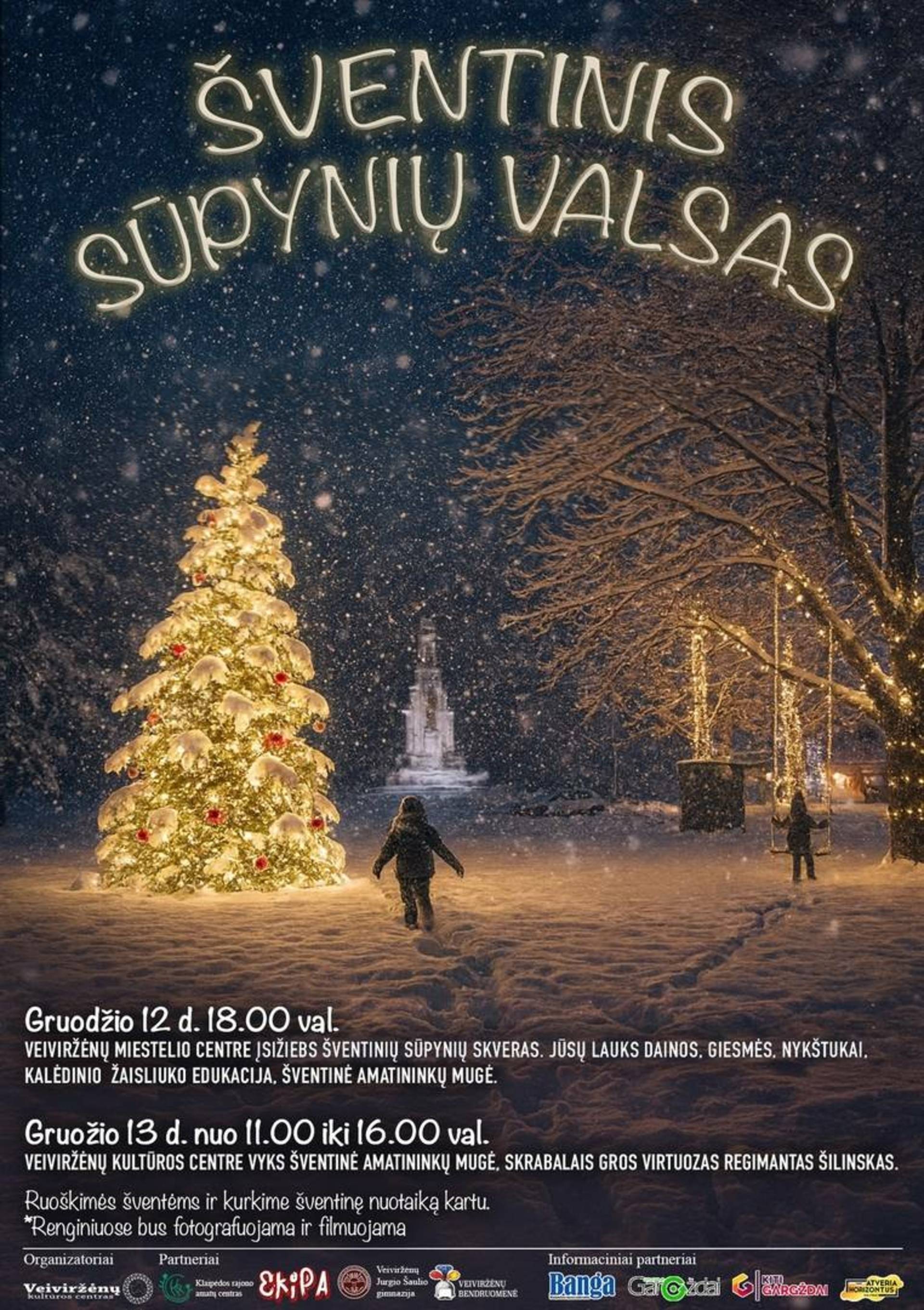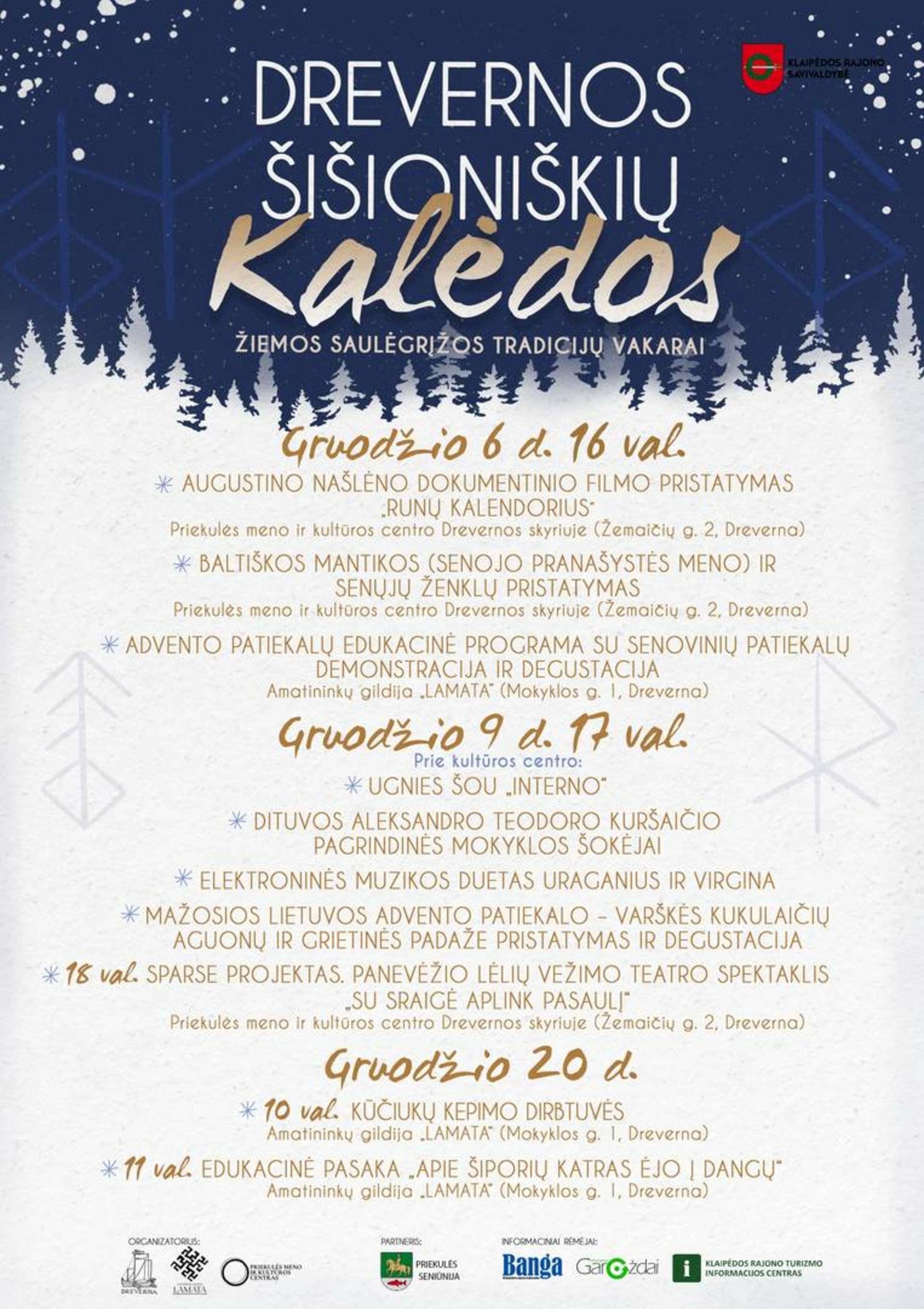 Gruodžio 12 d. 18.00 val. Veiviržėnų miestelio centre įsižiebs Šventinių sūpynių skveras ir prasidės amatininkų mugė. Programoje: šventinės dainos ir giesmės, nykštukai, kalėdinio žaisliuko edukacija, šventinė amatininkų mugė. Gruodžio 13 d. nuo 11.00 iki 16.00 val. Veiviržėnų kultūros centre vyks šventinė amatininkų mugė. Muzikinę nuotaiką kurs skrabalininkas Regimantas Šilinskas. Klaipėdos rajono amatų centre: autorinė Valentinos Kaubrienės paroda „Kalėdos iš rankdarbių skrynios“, autorinė Teresės Lygnugarienės paroda „Tylus riešinių pasakojimai“, kulinarinio paveldo degustacija, karšti gėrimai, blynai ir kiti skanumynai.