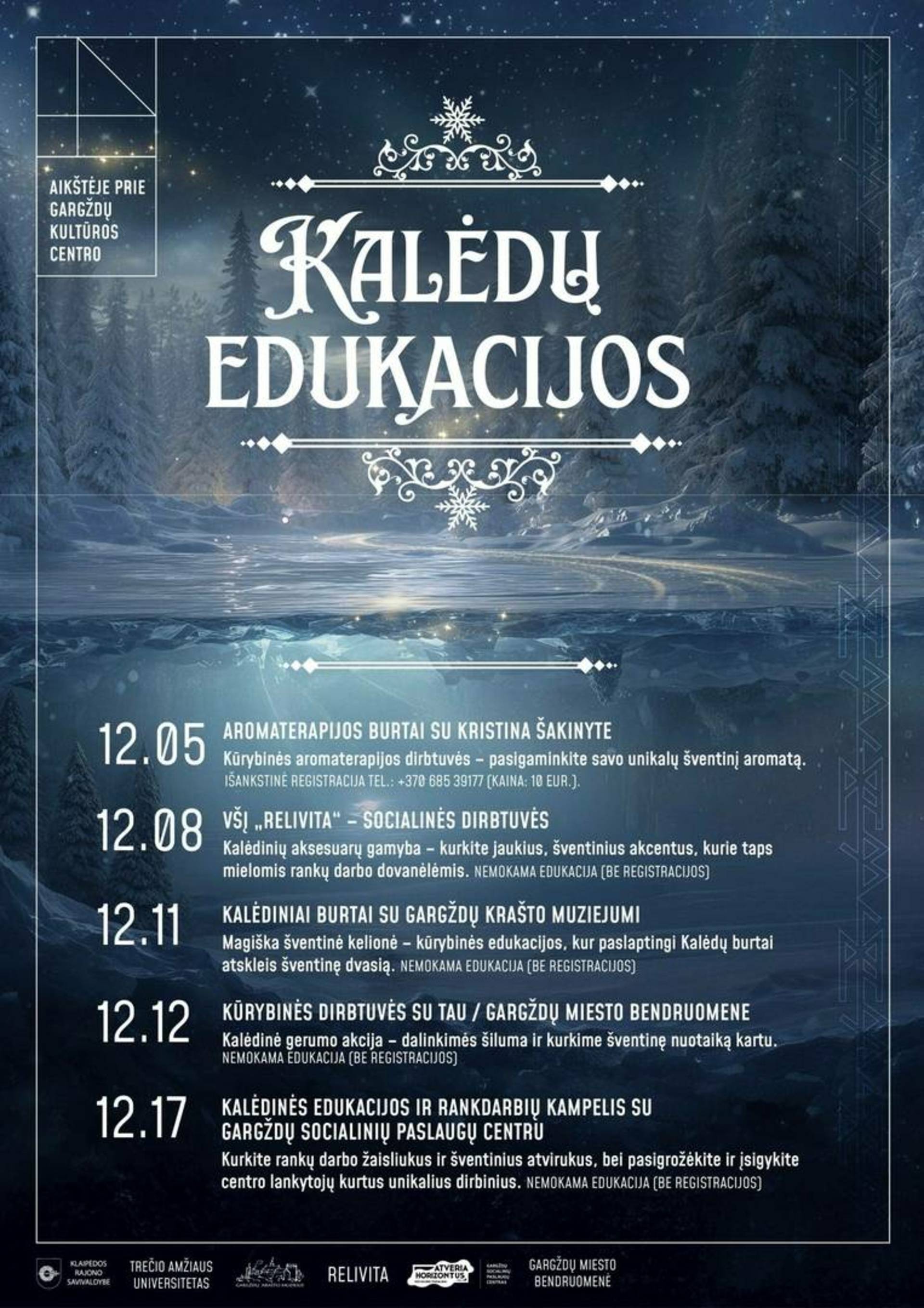 Šį gruodį kviečiame pasinerti į šventinę kūrybos kelionę – jaukias Kalėdines edukacijas, kuriose kiekvienas atras įkvėpimo, šilumos ir rankų darbo stebuklų. Čia laukia įvairios dirbtuvės, gerumo akcijos ir magiškos patirtys, sukuriančios tikrą šventės dvasią visai bendruomenei. Jūsų laukia magiška šventinė kelionė – kūrybinės edukacijos, kur paslaptingi Kalėdų burtai atskleis šventinę dvasią.
