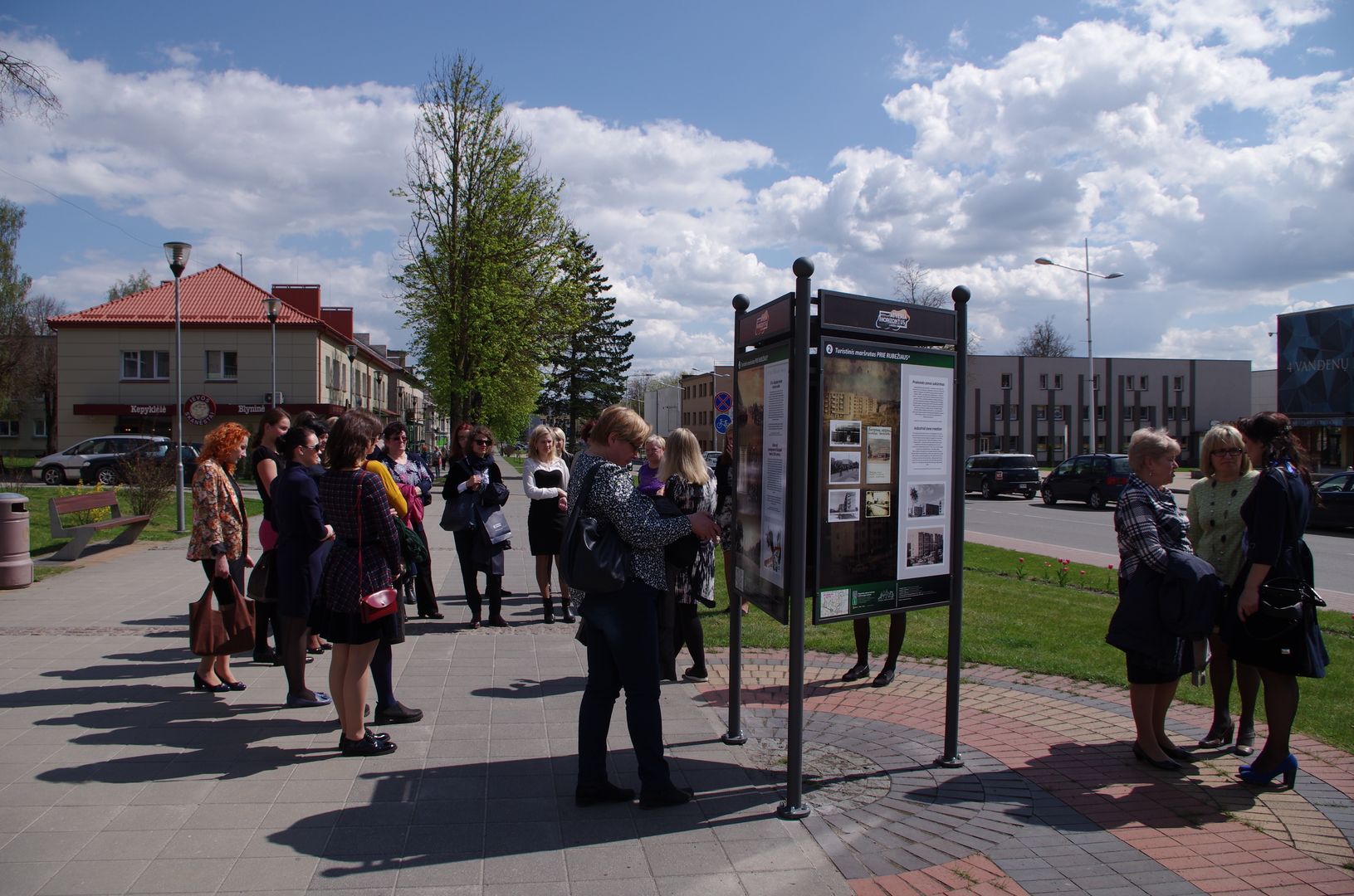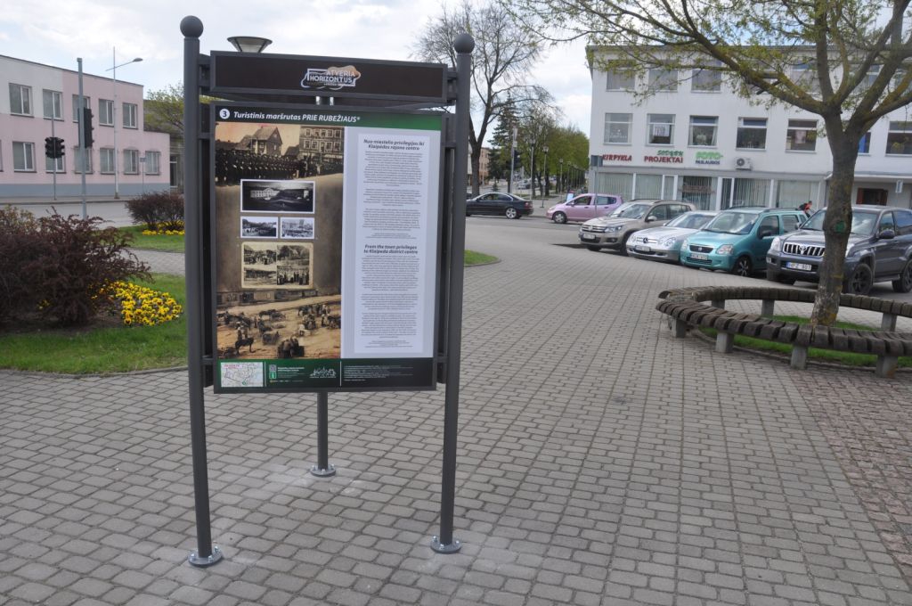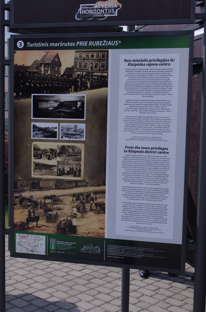 Savivaldybės aikštėje stovinčiame stende supažindinama su Gargždų bažnyčių istorija, bei kaip Gargždai iš gyvenvietės tapo mieteliu, vėliau - valsčiaus centru, o jau sovietinės okupacijos laikotarpiu, 1950m., – Klaipėdos rajono centru. Oficialiai, Gargždai miesteliu tapo 1600 m., kada gavo teisę kiekvieną penktadienį rengti turgų. Kassavaitinis turgus į Gargždus priviliojo daugiau amatininkų, kurie kūrėsi palei prekybinį kelią į Prūsiją, dabartinę J. Basanavičiaus gatvę. Pagrindine Gargždų miestelio gatve tapęs prekybinis kelias savo reikšmės neprarado iki pat XX a. I pusės, laikui einant jį papildo aplink aikštę ir miestelio gatvėse išsidėsčiusios parduotuvės.