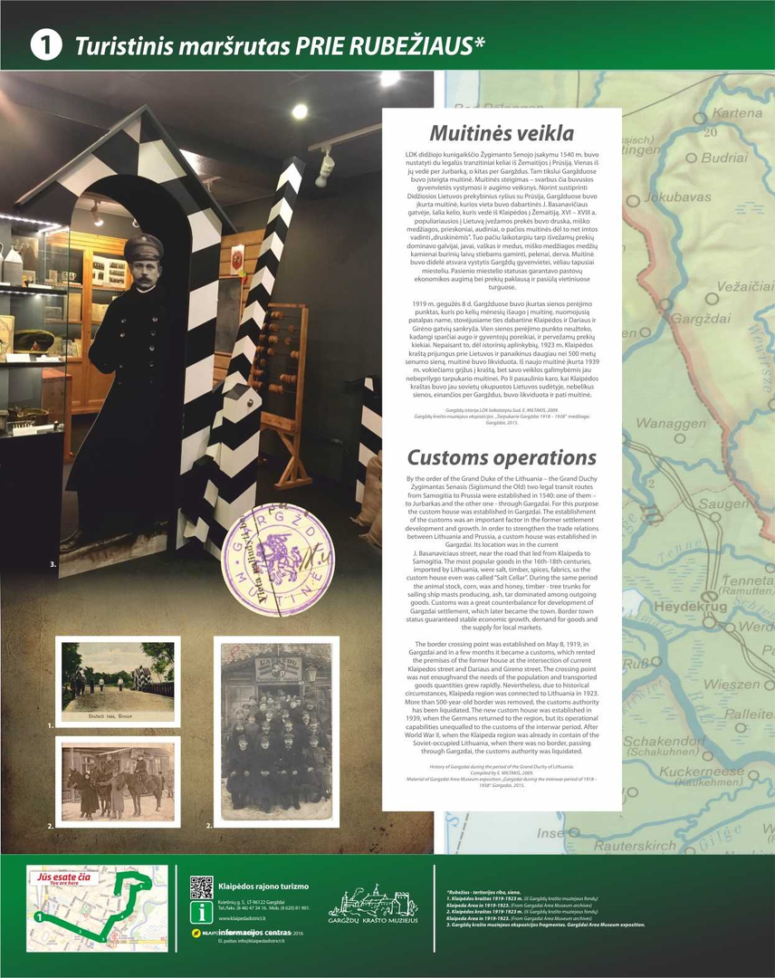 Maršrutas „Prie rubežiaus“ prasideda nuo pirmuoju numeriu pažymėtu stendu stovinčiu prie Gargždų autobusų stoties. Čia pradedami skleisti Gargždų miesto istorijos puslapiai, supažindinama jog Gargždai buvo pasienio gyvenvietė tarp Didžiosios Lietuvos ir Prūsijos. XVI a. čia įsteigta Gargždų muitinė, kuri ir lėmė gyvenvietės augimą ir vystymąsi, garantavo pastovų ekonomikos augimą bei prekių paklausą ir pasiūlą vietiniuose turguose. Pasienio gyvenvietės kasdienybėje kontrabanda gyvavo jau nuo pat XVI a., bet didžiausius mastus išvystė XIX a. Stende pateikiama informacija apie Gargžduose gyvenusią Žydų bendruomenę. Yra žinoma, kad tarpukario laikotarpiu, kai miestelyje gyveno apie 2000 žmonių, žydai sudarė apie 60 procentų visų Gargždų gyventojų.