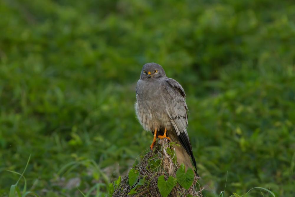 Išvaizda: Pilkas vanago formos paukštis su smailais ir labai ilgais sparnais, ilga uodega. Pilvas ir pažąstys su rudais dryžiukais. Sparnai su keturiais pirštais, juodais riešais. Iš viršaus sparnų ir kūno spalva pilka su juodais galais. Būdinga juoda juostelė per sparno ilgi iki juodų riešų. Akis ir kojos labai šviesios, geltonos. Patelė ruda išmarginta.