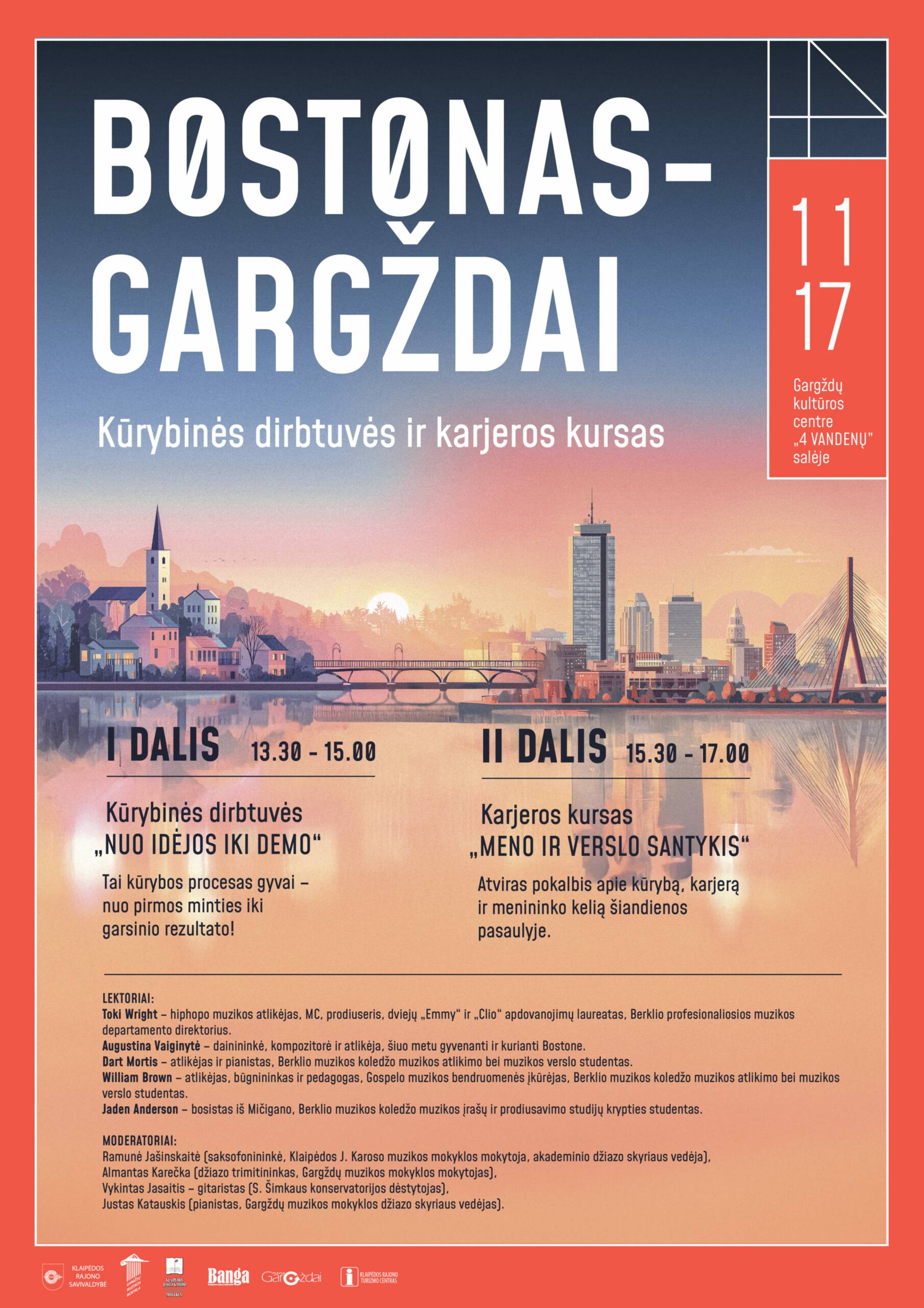 „Bostonas kviečia“ – tai išskirtinis kūrybinių dirbtuvių ir karjeros kurso renginys, vyksiantis lapkričio 17 d. Gargždų kultūros centre, suburiantis jaunus kūrėjus, muzikos pedagogus ir industrijos profesionalus iš Lietuvos ir Jungtinių Amerikos Valstijų. Renginį sudaro dvi dalys, atskleidžiančios visą kūrybinės kelionės procesą – nuo muzikos idėjos iki karjeros perspektyvų globaliame kontekste. Renginio kaina – 5 eurai (mokama vietoje). Pirmoje dalyje – kūrybinėse dirbtuvėse „Nuo idėjos iki demo“ – lektoriai iš Bostono kartu su savanoriu iš salės scenoje realiu laiku kurs naują muzikos kūrinį. Dalyviai galės stebėti, kaip gimsta melodija ir žodžiai, kuriama harmonija bei ritminis pagrindas, atliekamas vokalas, naudojamos garso įrašų programos (DAW) ir formuojamas galutinis demo įrašas. Antroje dalyje – karjeros kurse „Meno ir verslo santykis“ – vyks interaktyvi diskusija tarp svečių iš Bostono Berklio muzikos koledžo, renginio moderatorių ir dalyvių. Pokalbio metu bus nagrinėjamos šiuolaikiniam menininkui itin aktualios temos: kūrėjo vaidmuo inovacijų procese, meno ir verslo sinergija, kūrybos vertės suvokimas, karjeros planavimas bei menininko lyderystė šiuolaikinėje rinkoje. Lektoriai: Toki Wright – hiphopo muzikos atlikėjas, MC, prodiuseris, dviejų „Emmy“ ir „Clio“ apdovanojimų laureatas, Berklio profesionaliosios muzikos departamento direktorius. Augustina Vaiginytė – dainininkė, kompozitorė ir atlikėja, šiuo metu gyvenanti ir kurianti Bostone. Dart Mortis – atlikėjas ir pianistas, Berklio muzikos koledžo muzikos atlikimo bei muzikos verslo studentas. William Brown – atlikėjas, būgnininkas ir pedagogas, Gospelo muzikos bendruomenės įkūrėjas, Berklio muzikos koledžo muzikos atlikimo bei muzikos verslo studentas. Jaden Anderson – bosistas iš Mičigano, Berklio muzikos koledžo muzikos įrašų ir prodiusavimo studijų krypties studentas. Moderatoriai: Ramunė Jašinskaitė – saksofonininkė, Klaipėdos J. Karoso muzikos mokyklos mokytoja, akademinio džiazo skyriaus vedėja. Almantas Karečka – džiazo trimitininkas, Gargždų muzikos mokyklos mokytojas. Vykintas Jasaitis – gitaristas, S. Šimkaus konservatorijos dėstytojas. Justas Katauskis – pianistas, Gargždų muzikos mokyklos džiazo skyriaus vedėjas. Šio renginio tikslas – paskatinti jaunus kūrėjus ir pedagogus pažvelgti į meną kaip į visapusišką profesinę sritį, kurioje kūrybiškumas ir verslumas eina išvien. Dalyviai turės galimybę ne tik įgyti naujų žinių, bet ir išbandyti jas praktiškai – nuo kūrinio idėjos iki realaus įrašo. Renginio organizatoriai: Gargždų muzikos mokykla, Klaipėdos J. Karoso muzikos mokykla Partneris: Gargždų kultūros centras
