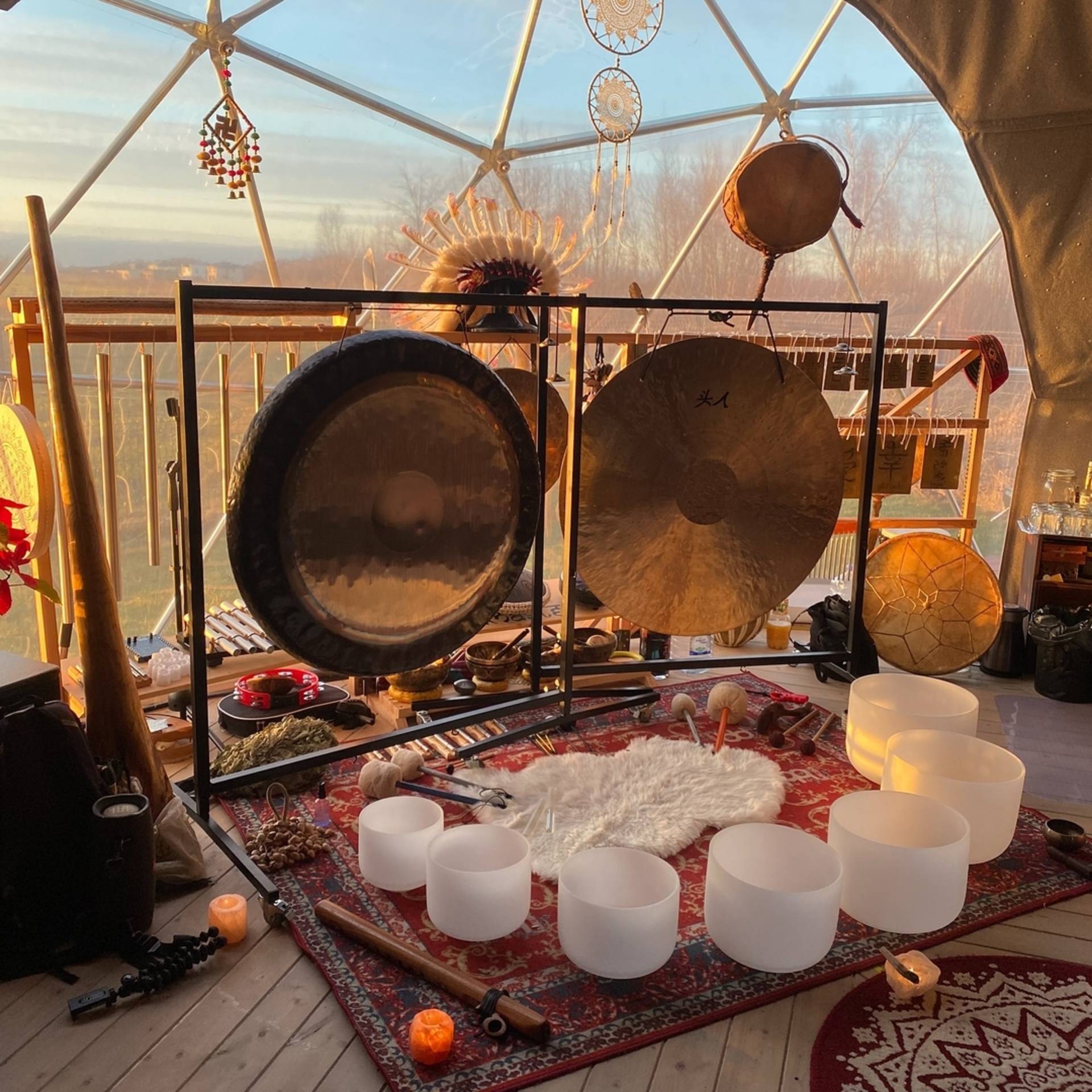 Garsų kelionės, meditacijos metu gyvai skamba įvairių laikotarpių ir kultūrų instrumentai: gongai, krištoliniai dubenys, didžeridu, šamaninis būgnas ir daugybė kitų garselių.