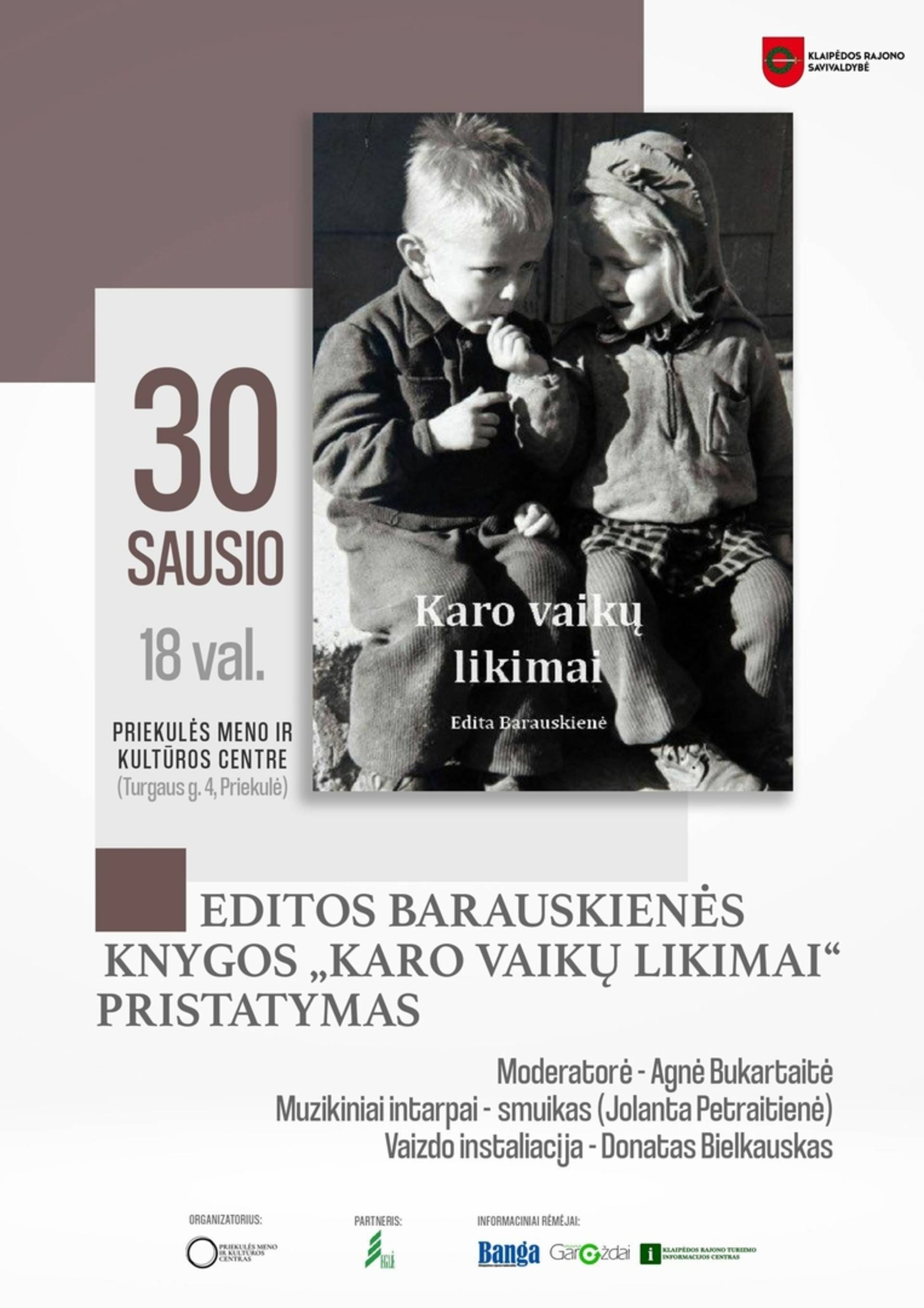 Sausio 30 d. 18 val. kviečiame į Editos Barauskienės knygos „Karo vaikų likimai“ pristatymą Priekulės meno ir kultūros centre. Pristatomas kūrinys yra jautrus pasakojimas apie karo paženklintą vaikystę, lietuvybės saugojimą ir istorijos pamokas šiandienai.