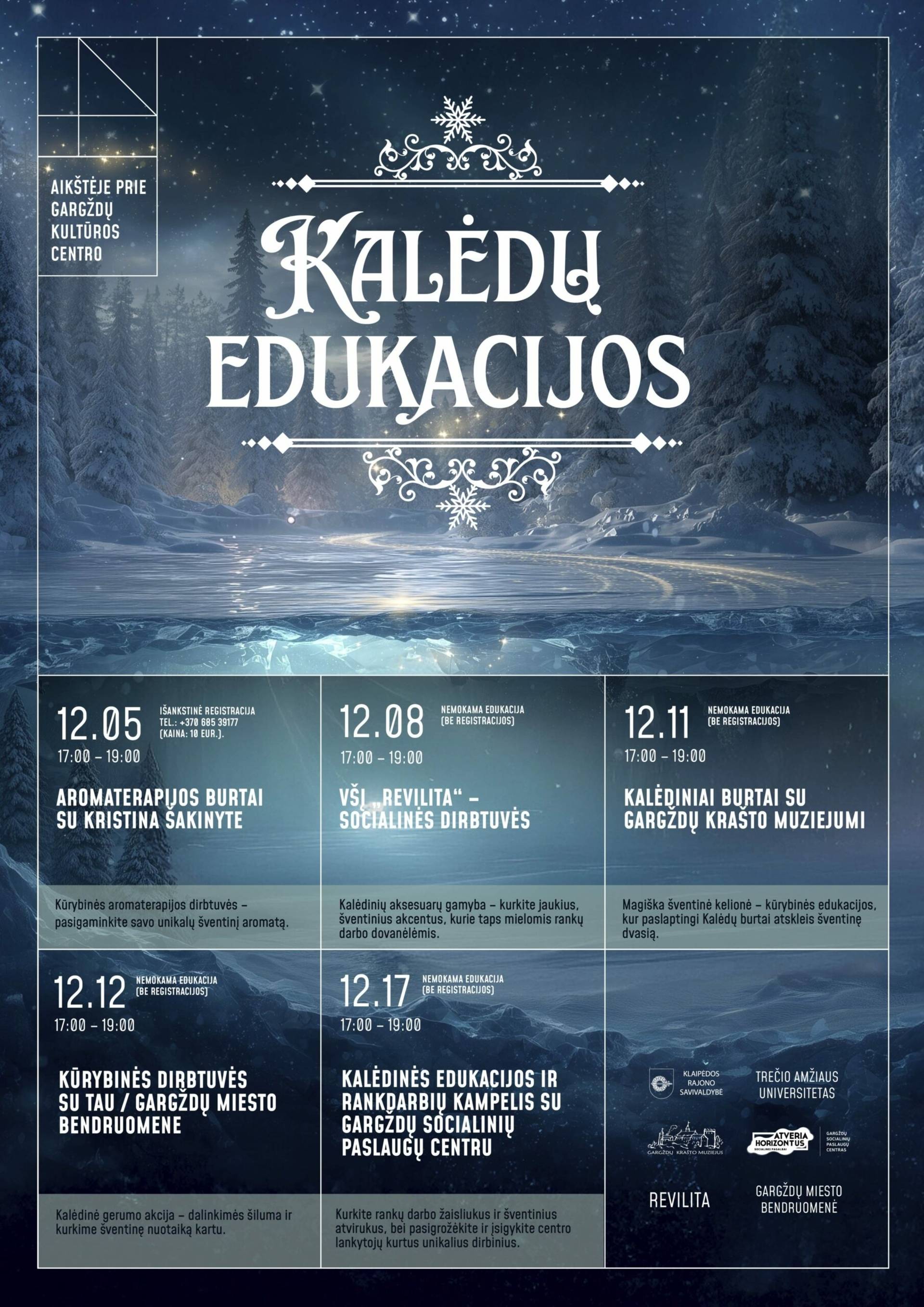 Šį gruodį kviečiame pasinerti į šventinę kūrybos kelionę – jaukias Kalėdines edukacijas, kuriose kiekvienas atras įkvėpimo, šilumos ir rankų darbo stebuklų. Čia laukia įvairios dirbtuvės, gerumo akcijos ir magiškos patirtys, sukuriančios tikrą šventės dvasią visai bendruomenei. 8 d. – VšĮ „Relivita“ – Socialinės dirbtuvės Kalėdinių aksesuarų gamyba – kurkite jaukius, šventinius akcentus, kurie taps mielomis rankų darbo dovanėlėmis. NEMOKAMA EDUKACIJA (BE REGISTRACIJOS).