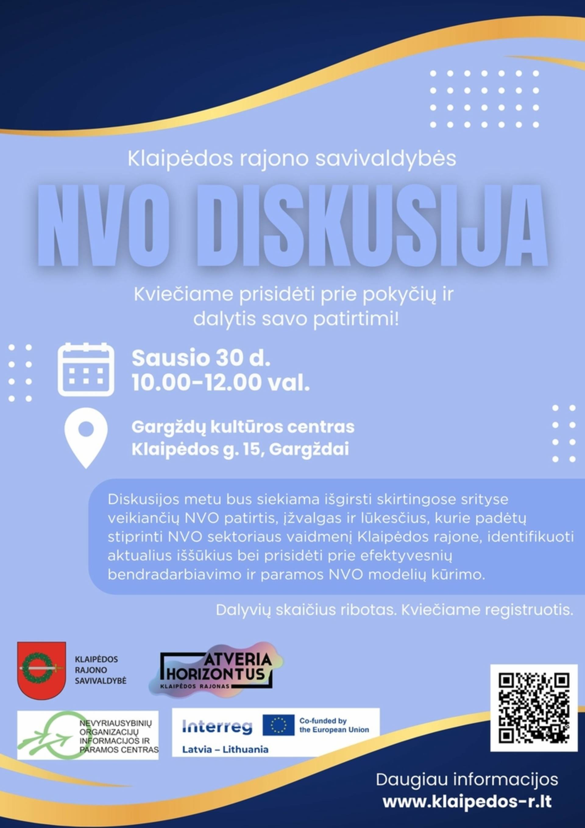 Jos metu bus siekiama išgirsti skirtingose srityse veikiančių NVO patirtis, įžvalgas ir lūkesčius, kurie padėtų stiprinti NVO sektoriaus vaidmenį Klaipėdos rajone, identifikuoti aktualius iššūkius bei prisidėti prie efektyvesnių bendradarbiavimo ir paramos NVO modelių kūrimo.