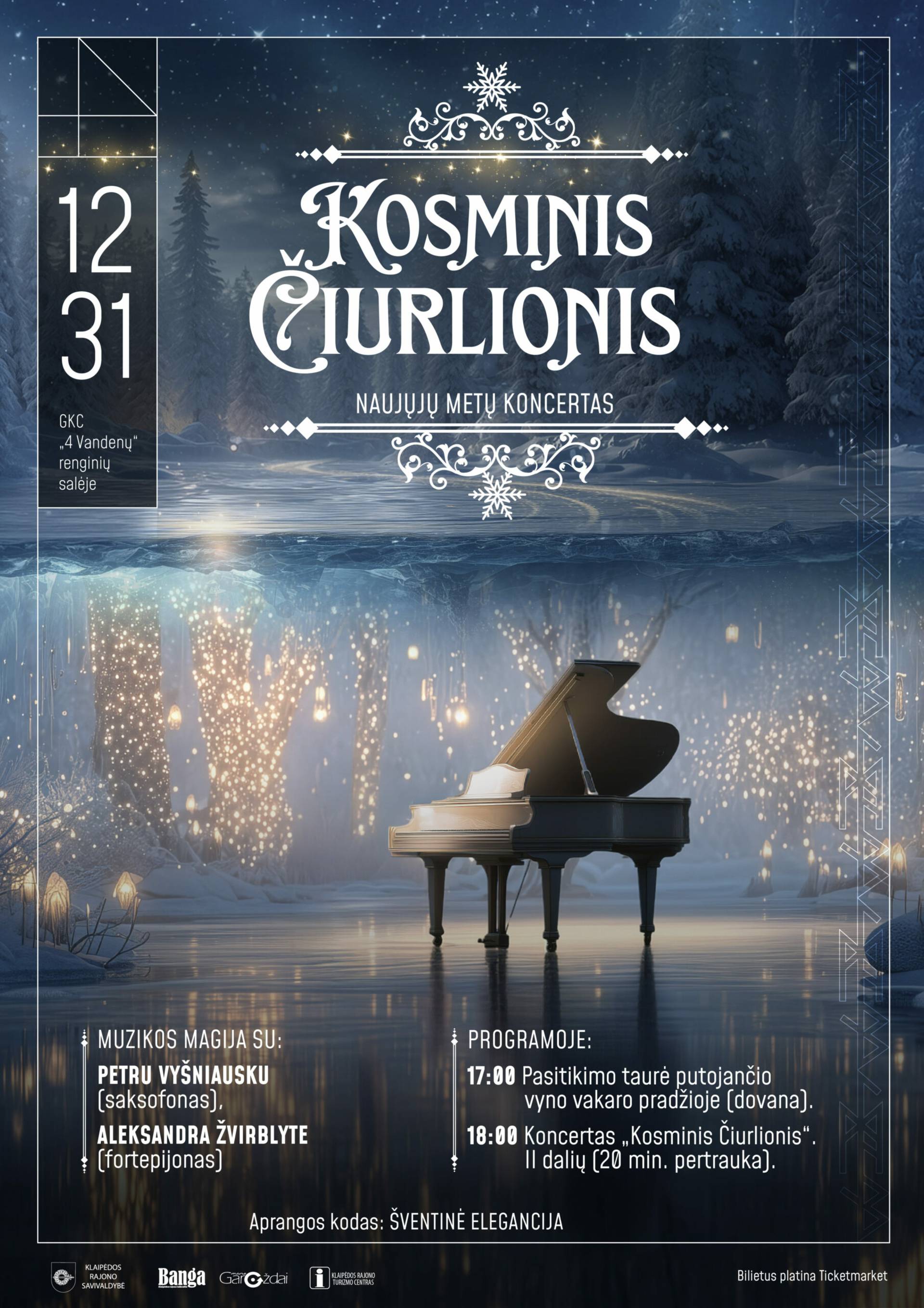 Gruodžio 31-ąją kviečiame į išskirtinį Naujųjų metų koncertą „Kosminis Čiurlionis“. GKC „4 Vandenų“ salėje susitiks legendinis saksofonininkas Petras Vyšniauskas ir tarptautinį pripažinimą pelniusi pianistė Aleksandra Žvirblytė. Duetas pristatys subtilų originalių Čiurlionio ir jo amžininkų kūrinių susiliejimą su laisvų improvizacijų energija – vakaras, kuris paliks nepamirštamą įspūdį.