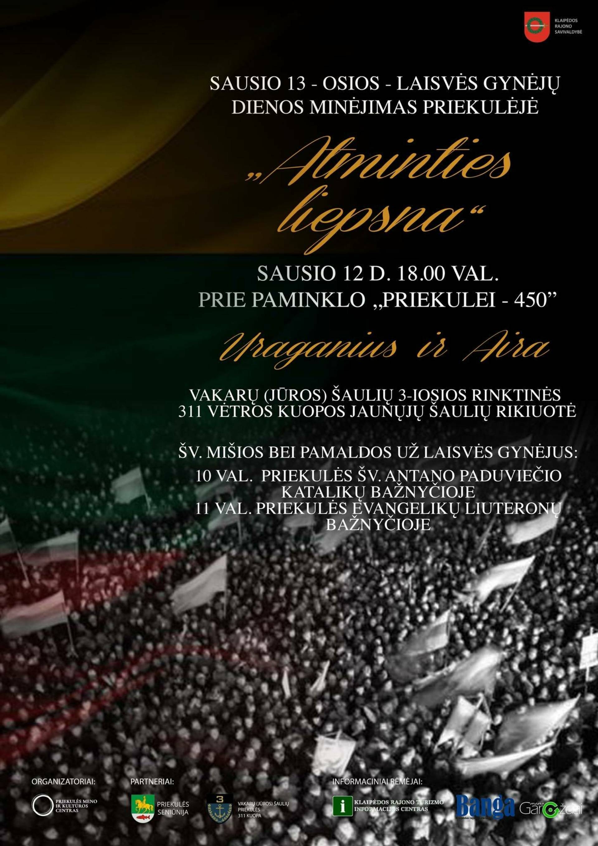 Sausio 12 d. 18.00 val. susitikime uždegti atminties liepsną prie paminklo ,,Priekulei - 450\". Programoje Uraganius ir Aira