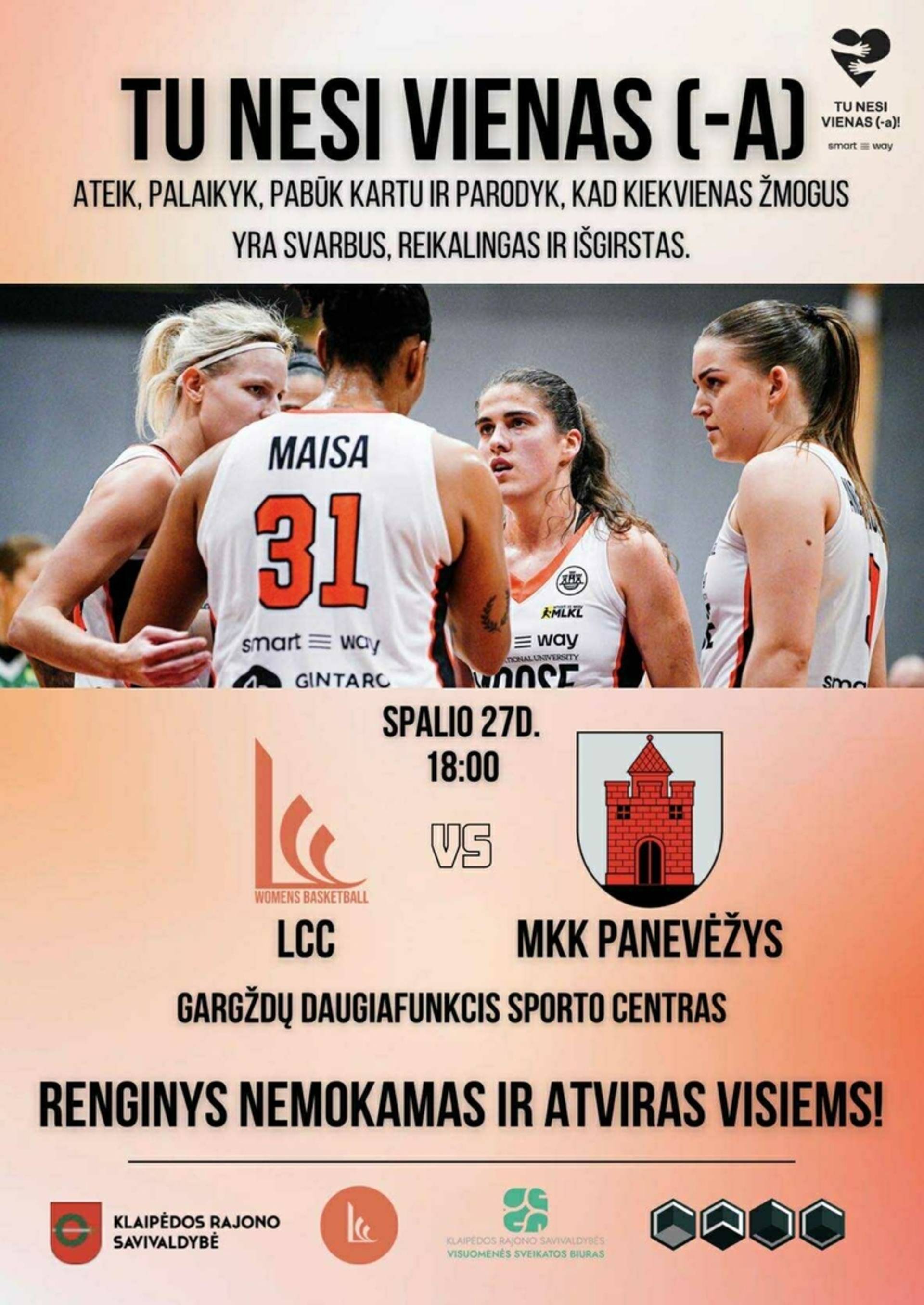 Spalio 27 d., 18 val. Gargždų Daugiafunkciame sporto centre Klaipėdos regiono moterų krepšinio komanda LCC žais Moterų krepšinio lygos rungtynes prieš Panevėžio komandą. Rungtynės vyks kartu su socialine akcija „Tu nesi vienas (-a)“, kurios tikslas – savižudybių prevencija ir emocinės gerovės stiprinimas.