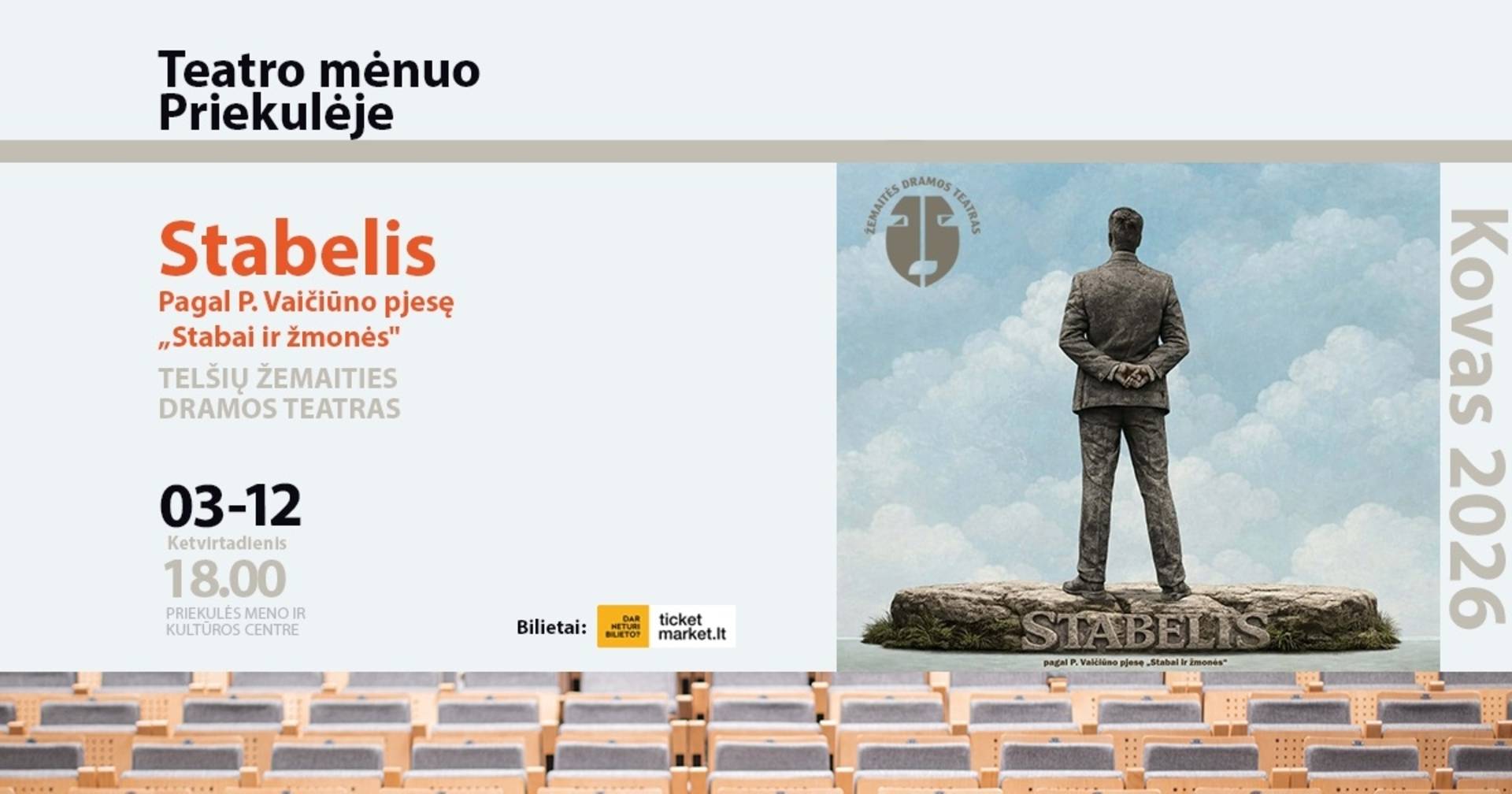 Kovo 12 d. | 18.00 val.Telšių Žemaitės dramos teatras „Stabelis“ – premjera pagal Petro Vaičiūno pjesę „Stabai ir žmonės“.Gili ir aktuali istorija apie vertybių konfliktą, žmogaus pasirinkimus ir vidines kovas.